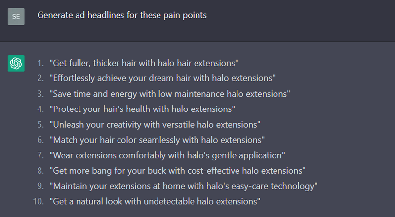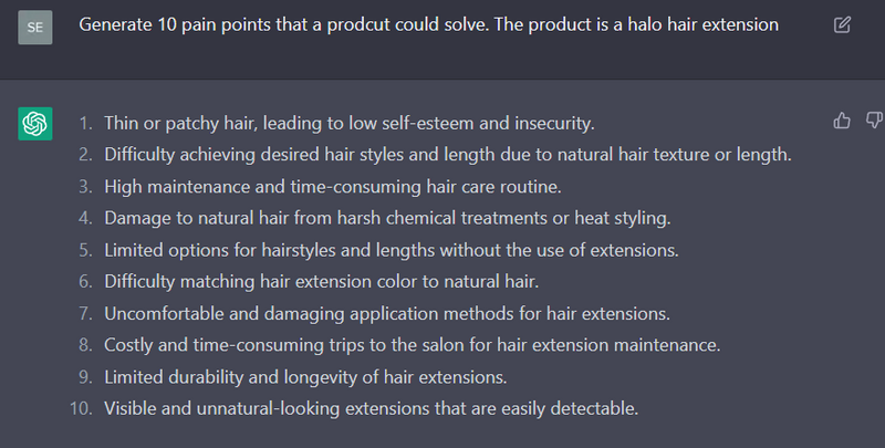 Ask your new robot friend to come up with pain points for selling your product. Unless you are selling something extremely obscure, it will give you a list of problems that your product could solve.