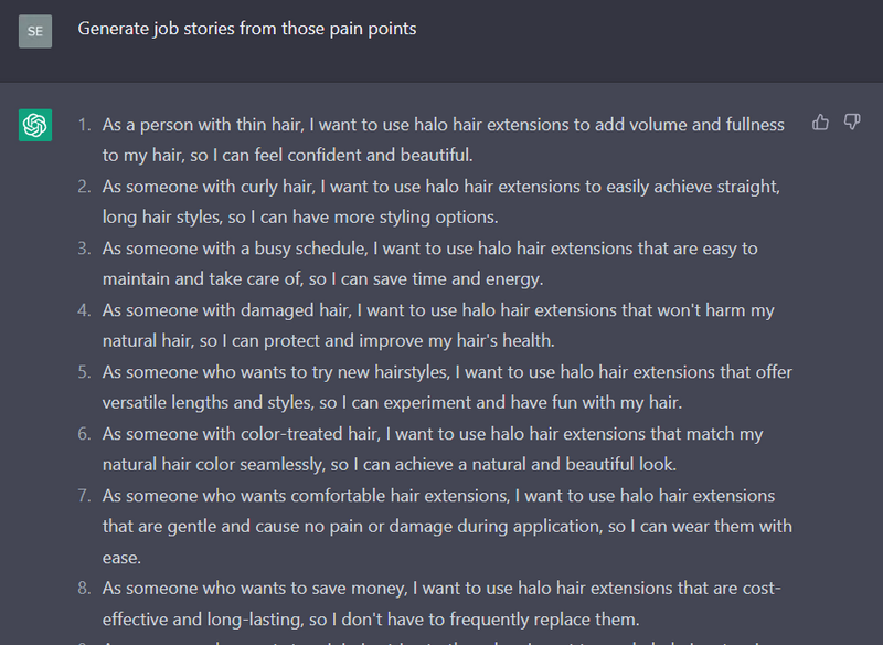 ChatGPT can create short job stories out of the pain points it has generated. In our tests, the AI had little trouble coming up with the kind of users that could have encountered a pain point and describing the reason why it is important for them.