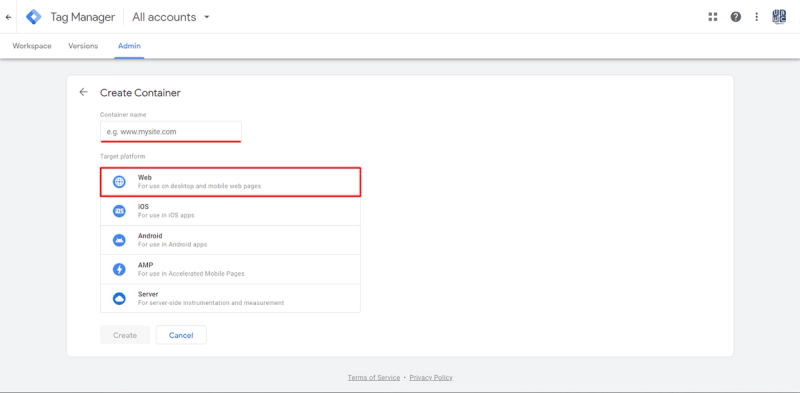 Next, a Web GTM Container must be created