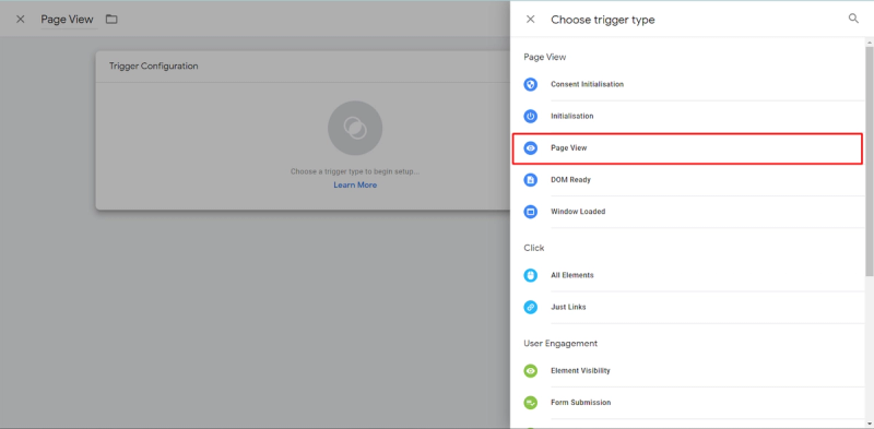 You can either choose that this “Page View” Trigger will “Fire” on all Website’s Pages or only on some pages. In our example, this is set up for All Website Pages.