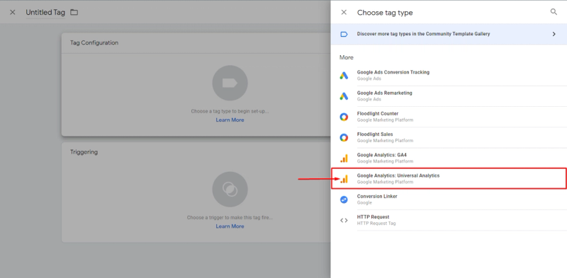 First, in Tag Configuration, our type of Google Analytics must be chosen, which in my case is Universal Analytics