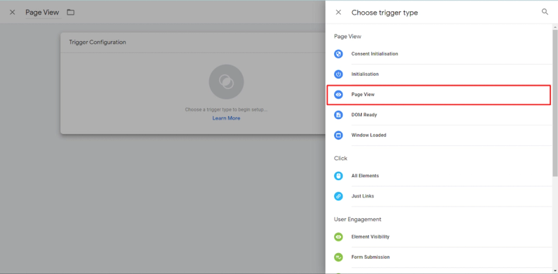 You can either choose that this “Page View” Trigger will “Fire” on all Website’s Pages or only on some pages. In our example, this is set up for All Website Pages.