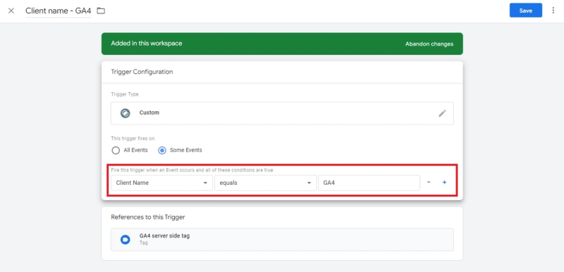 The trigger of this tag will also be similar to that of Universal Analytics except for the firing conditions where Client Name will be GA4.