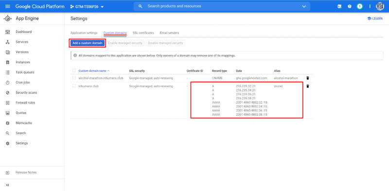 In the “App Engine” settings, you must add a new custom domain.