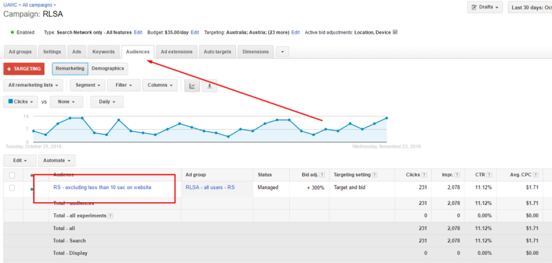 Remarketing lists for search ads (RLSA) allows you to target your previous website visitors, using keyword targeting. It uses the same search campaigns, but you are targeting your previous website visitors directly, instead of new customers. In most cases, this results in a higher conversion rate: