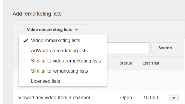 To add a remarketing list, navigate to the Audience tab in your search campaign, and add the required audience: