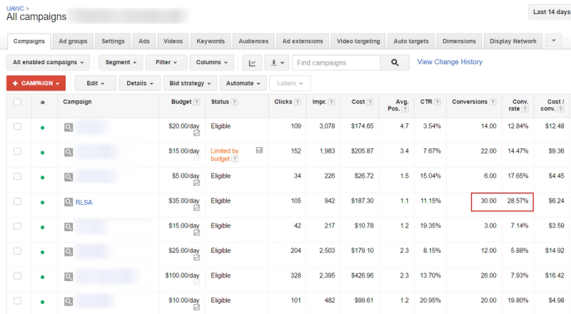 Remarketing lists for search ads (RLSA) allows you to target your previous website visitors, using keyword targeting. It uses the same search campaigns, but you are targeting your previous website visitors directly, instead of new customers. In most cases, this results in a higher conversion rate: