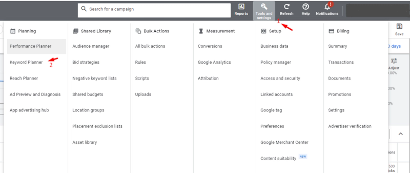 Then, click on the wrench icon under “Planning” and choose Keyword Planner.