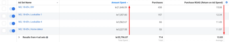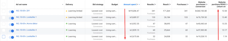 The total campaign ad budget was 1000 NOK and each ad set had a 100 NOK daily spend limit. For this test, half of the ad set budget was set up manually, and the other half of the budget was set up by the Facebook algorithm. As a result, we significantly scaled the clients’ results with the highest ROAS at the lowest cost.