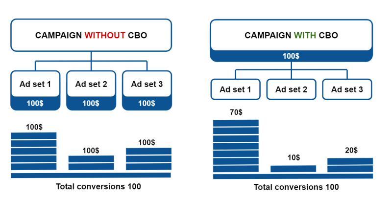 CBO is a Facebook option that manages your budget and reallocates it between ad sets to get the best results within the campaign. This means that you set only one budget on the campaign level that is automatically distributed between ad sets in real-time. Take a look at the comparison of campaigns with and without the CBO option in Figure 1.
