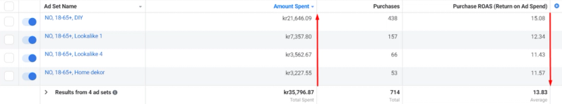 The total campaign ad budget was 1000 NOK and each ad set had a 100 NOK daily spend limit. For this test, half of the ad set budget was set up manually, and the other half of the budget was set up by the Facebook algorithm. As a result, we significantly scaled the clients’ results with the highest ROAS at the lowest cost.
