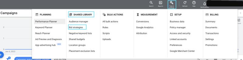 At the top right of the Google Ads menu, select the “Tools and Settings” option. Search for the “Search Library” option and choose “Bid Strategies.”