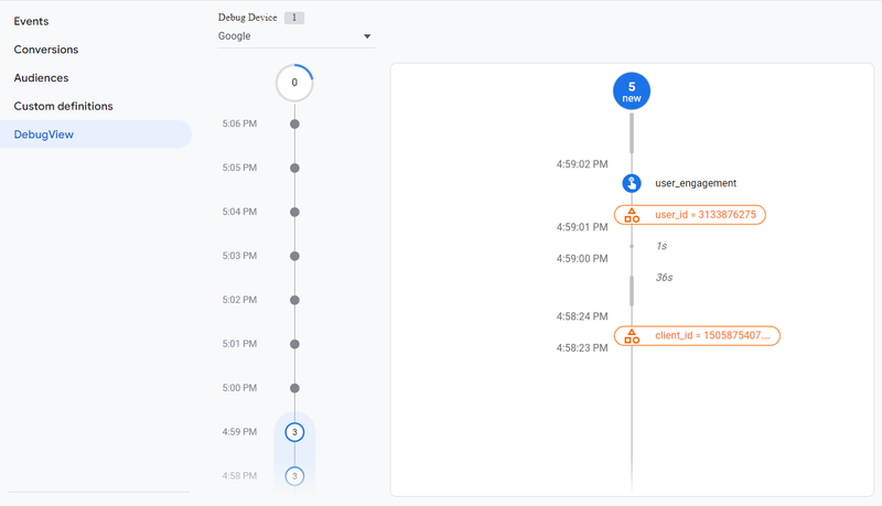 If you select any subsequent event from the list after the user_id item has been highlighted with orange color, just click on its User Properties section on the right side. The user_id property should be listed there, and its value must be the same as the one you saw in the Google Tag Manager preview mode. Moreover, we could find two additional user properties: Client ID and user id dimension. Please look through the Useful Tips section below where we describe why you need them and how they can be sent.