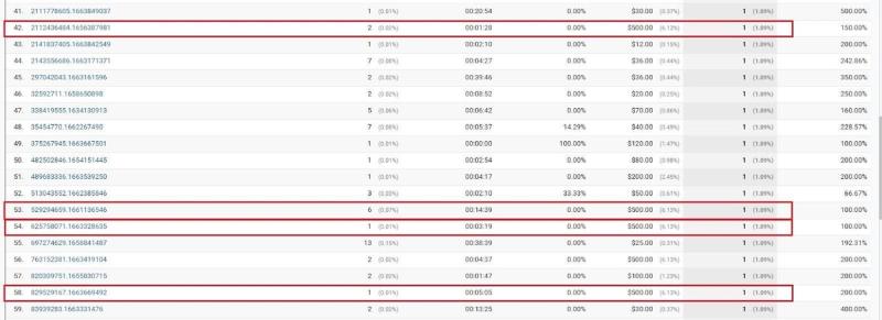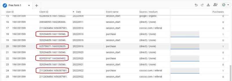 When we compared the data from Universal Analytics during the same time period, we found all these transactions with the same Client IDs. Therefore, they were held by the same User ID account.