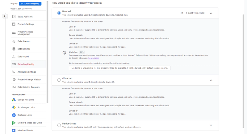 Officially released in mid October 2020, Google Analytics 4 launched different systems of user identification in Google Analytics 4 in comparison to the Universal Analytics. Three types of default reporting identities can be chosen in the Reporting Identity section of the GA4 property settings: the first is the Blended model, which contains User ID, Google Signals, Device ID, and Modeling methods (in Beta now), the second is Observed, which contains only first three methods above, and the third is the Device-based model where only the Device ID will be used.