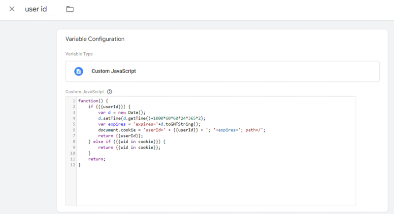 After that, a Custom JavaScript Variable checks if the Data Layer contains User ID value and then stores it in a cookie.