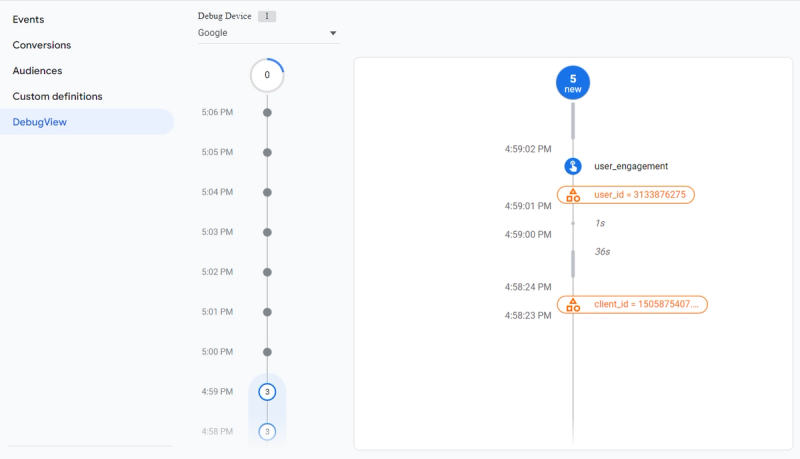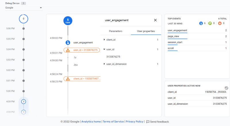 If you select any subsequent event from the list after the user_id item has been highlighted with orange color, just click on its User Properties section on the right side. The user_id property should be listed there, and its value must be the same as the one you saw in the Google Tag Manager preview mode. Moreover, we could find two additional user properties: Client ID and user id dimension. Please look through the Useful Tips section below where we describe why you need them and how they can be sent.