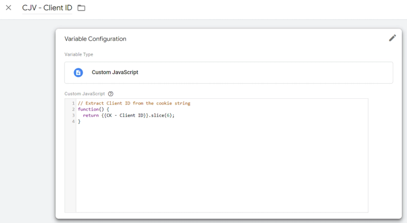 Then, create a Custom Javascript variable (CJV) that extracts this Client ID value from this cookie variable. After that, CJV is sent to GA as a value of Client ID user property with every hit.