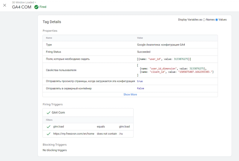 As we have set our GA4 configuration tag firing by Window Loaded trigger, we should find it in the preview mode. Switching to the Values in the top-right corner of the preview mode shows that our tag also sent the user_id parameter with a certain value.