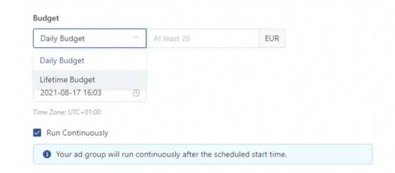 The budget can be set for campaigns as well as ad groups (a campaign can consist of several ad groups). Budgets can be divided into two types: lifetime budgets and daily budgets.