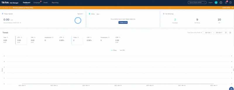 When it comes to the TikTok advertising platform overview, we have the following structure of the TikTok Ads manager: Dashboard, Campaign, Assets, and Reporting.