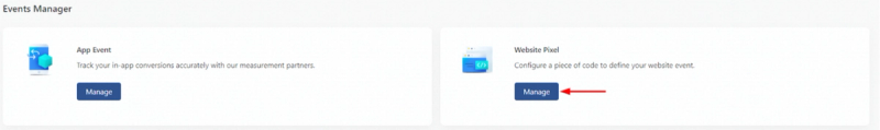 You can create a pixel in the “Event” tab, then click “Manage”.
